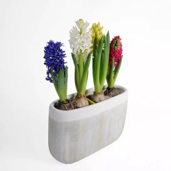 Гиацинты относятся к многолетним луковичным растениям. Высота растения 20 - 25 см, листья прикорневые, узкие. Цветки собраны на верхушке стебля в виде кисти. Околоцветник их, в виде колокольчатой воронки, ярко окрашен и с отогнутыми лопастями. Цветы гиацинтов бывают: белые, бледно-жёлтые, красные и розовые разнообразных оттенков, голубые и лиловые, почти чёрные, ярко жёлтых нет, но есть пестрые. Встречаются махровые и гладкие гиацинты.