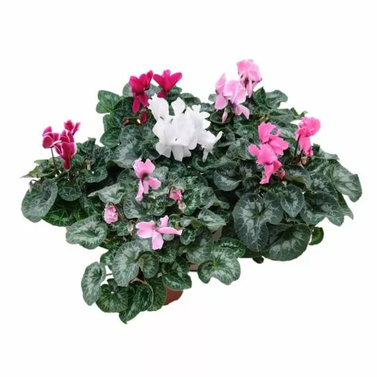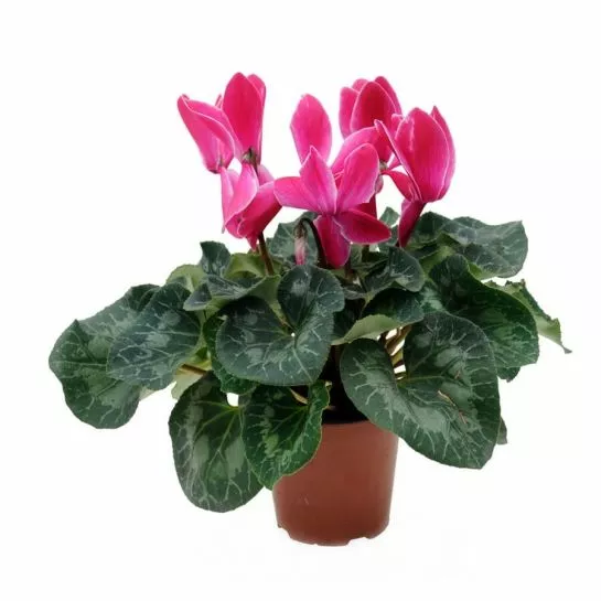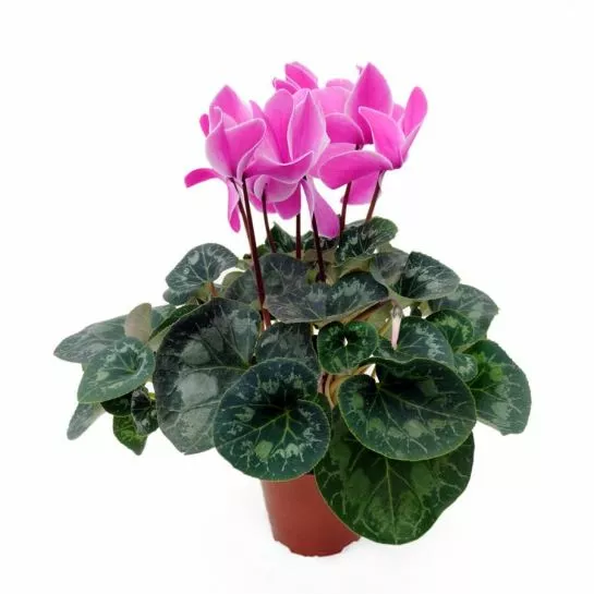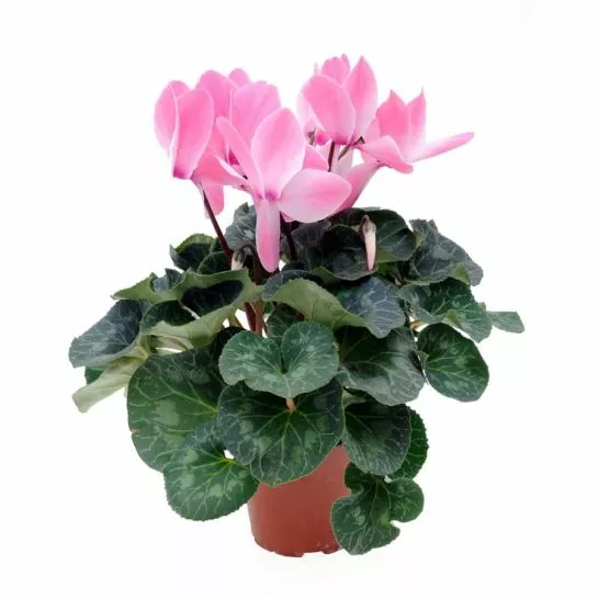 Цикламен (лат. Cyclamen) - род растений из семейства Мирсиновые (Myrsinaceae), включающий в себя около 20 видов. Это многолетнее травянистое растение, распространеное в Средиземноморье. Данный вид растений любит влажный воздух, потому горшок необходимо ставить на поднос с галькой или мокрым торфом. Опрыскивать цикламен нельзя, можно только увлажнять воздух вокруг растения из очень мелкого пульверизатора.