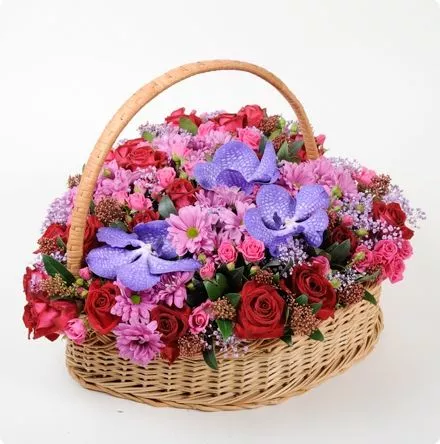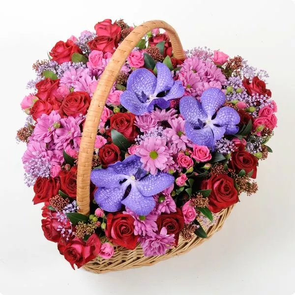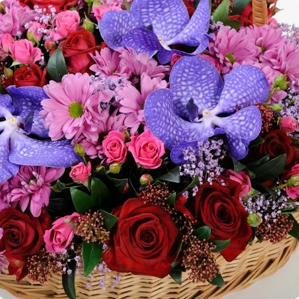 корзина в форме сердца из красных роз, фиолетовых орхидей, розовых